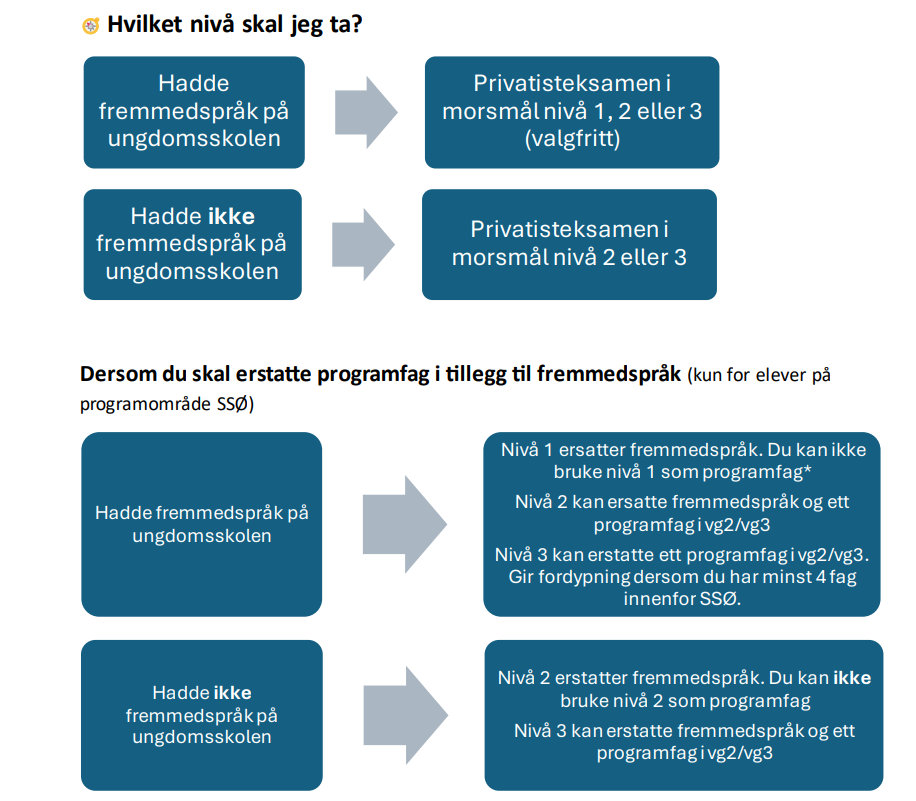 *Dersom du har fremmedspråk på ungdomsskolen, tar morsmål nivå 1 i tillegg til vanlig fremmedspråkundervisning, kan du bruke nivå 1 som programfag.