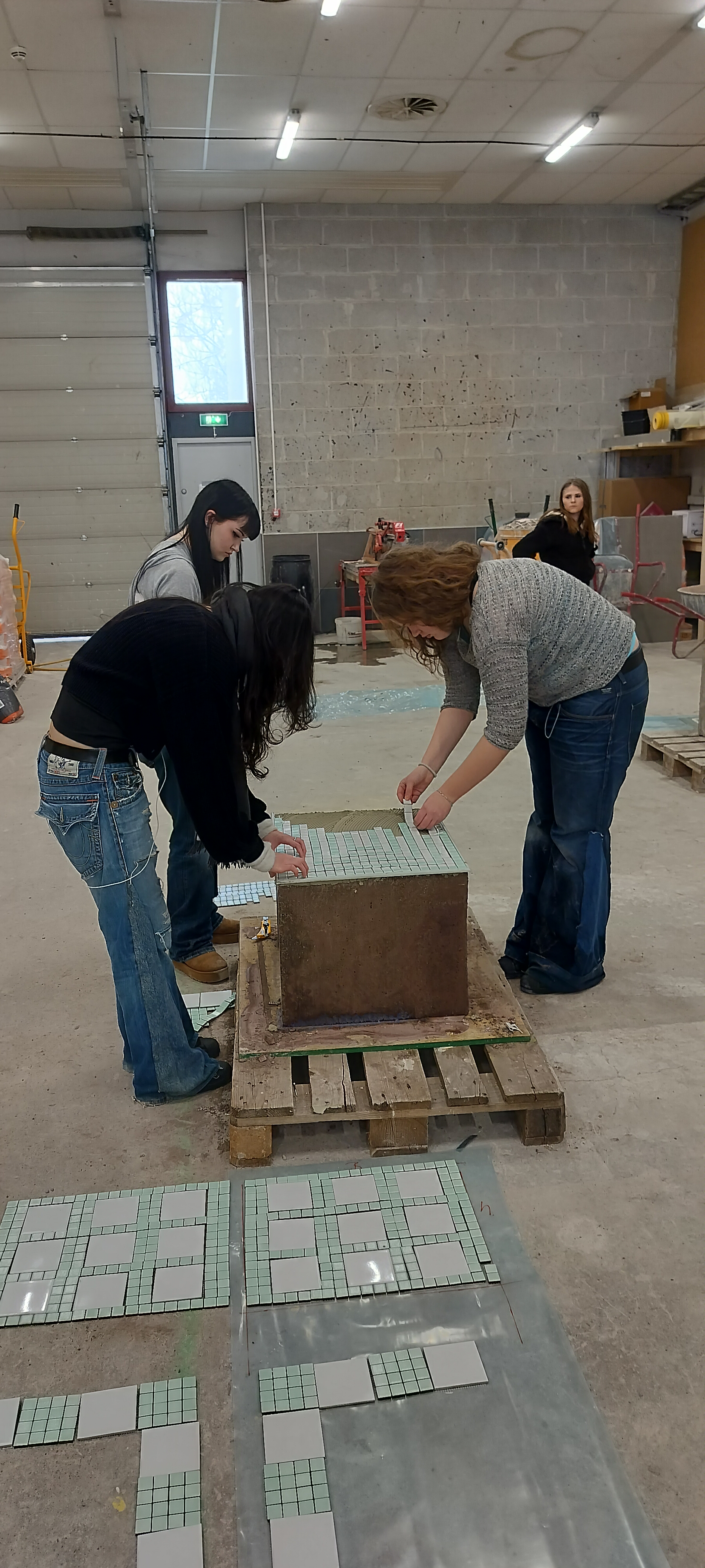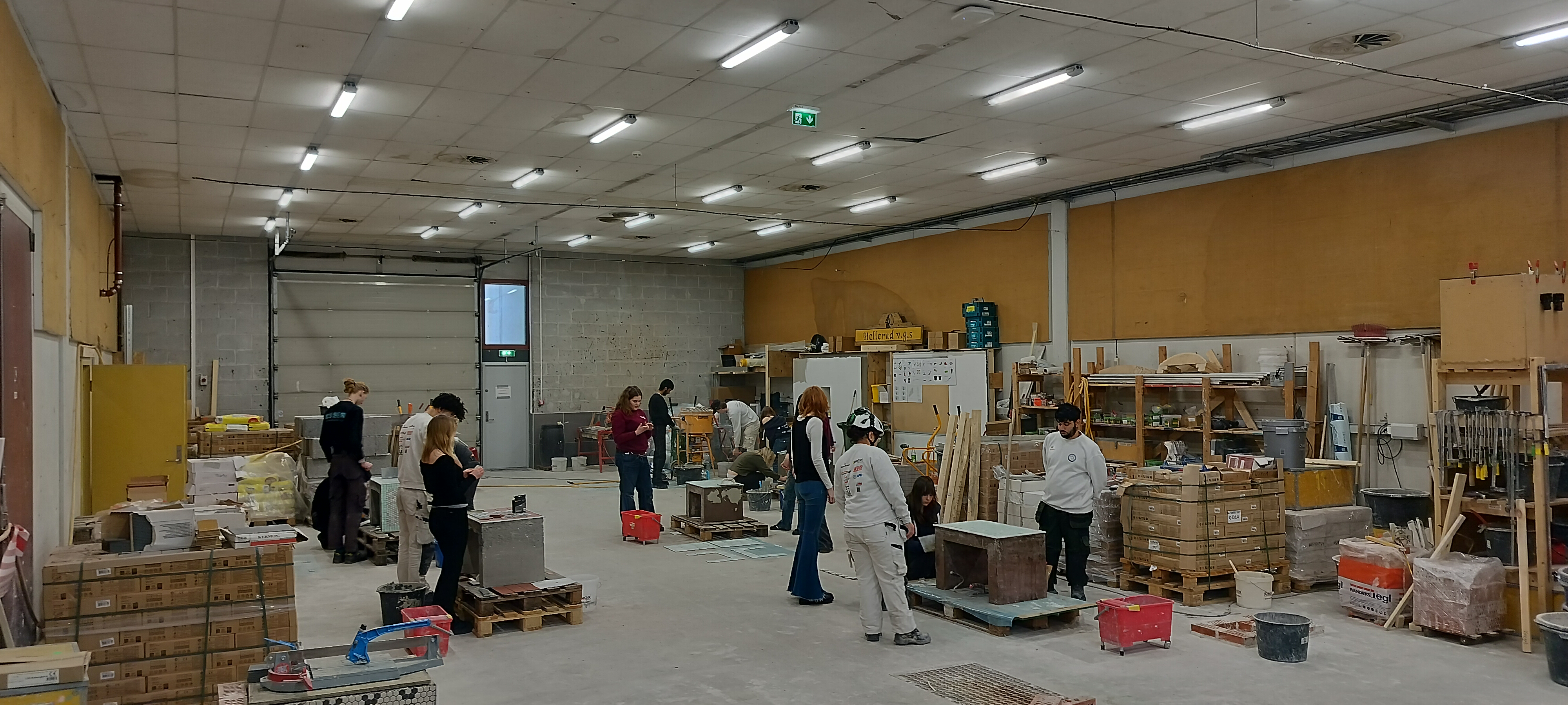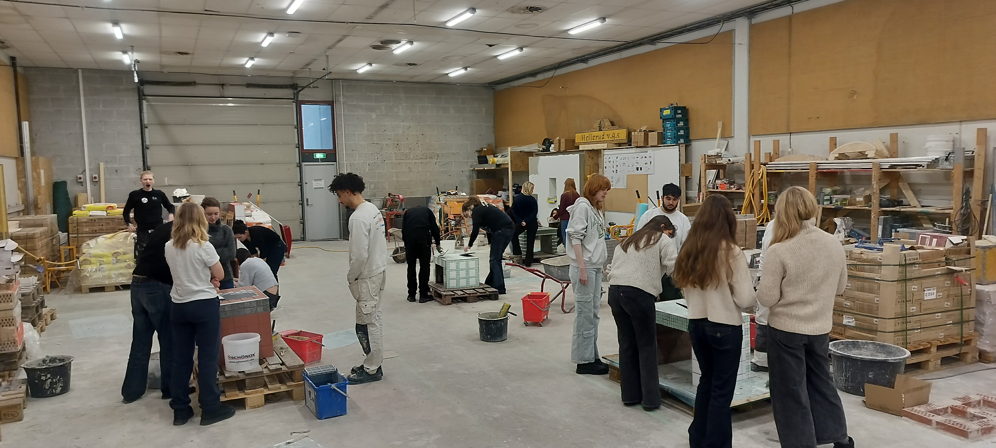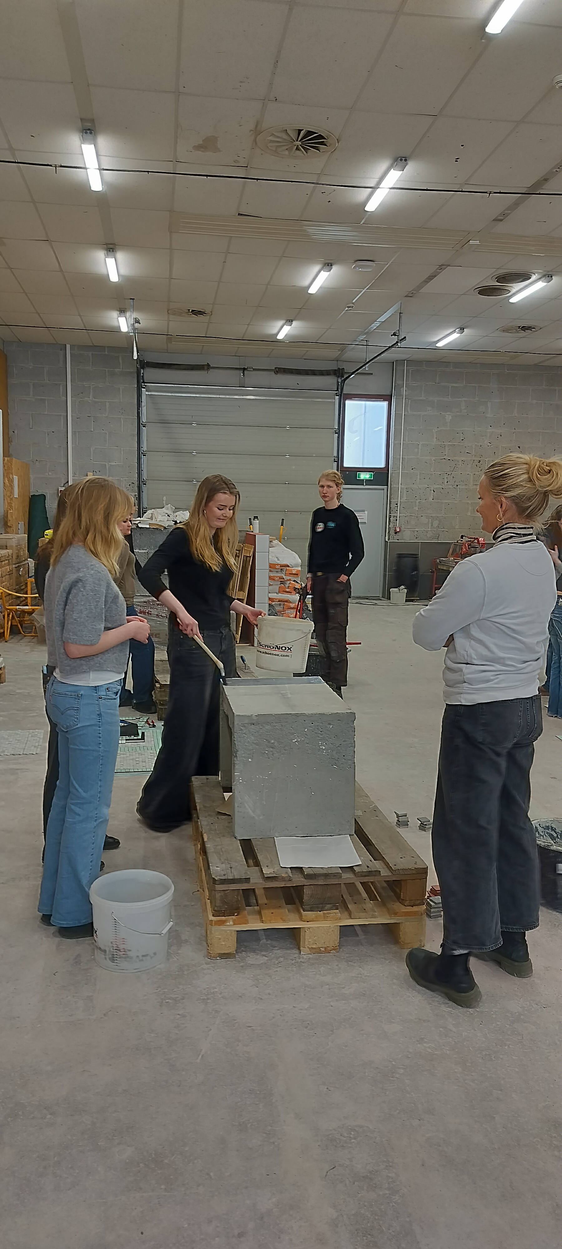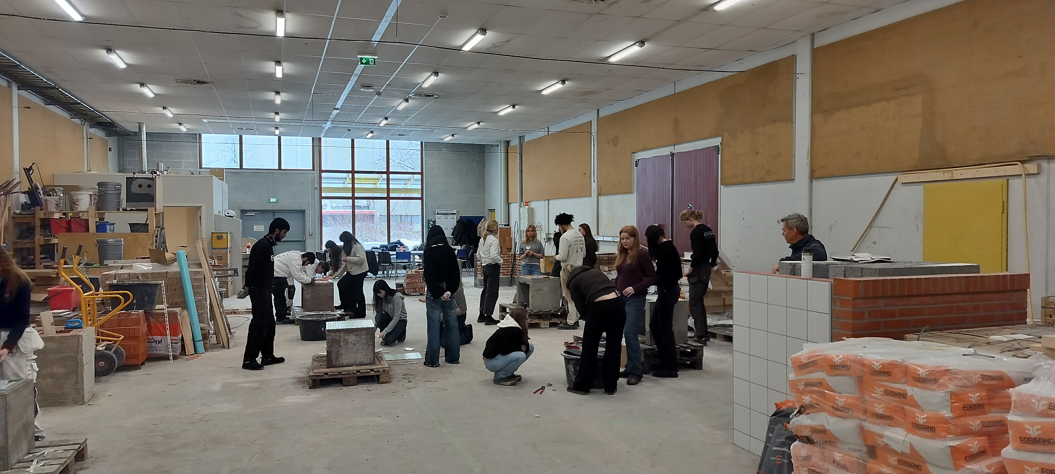 VG2 Betong og mur ved Hellerud vgs har denne uken hatt besøk av VG3 Interiør fra Edvard Munch vgs på et tverrfaglig samarbeid for å lære av hverandre. Elevene har samarbeidet kjempebra og det har vært høy produksjon i hallen vår